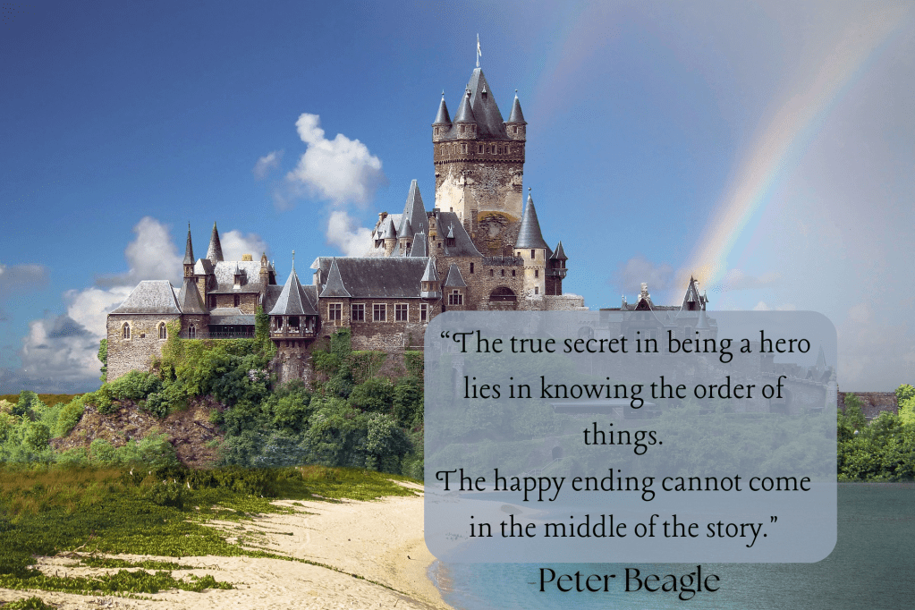 “The true secret in being a hero lies in knowing the order of things. The swineherd cannot already be wed to the princess when he embarks on his adventures, nor can the boy knock on the witch’s door when she is already away on vacation. The wicked uncle cannot be found out and foiled before he does something wicked. Things must happen when it is time for them to happen. Quests may not simply be abandoned; prophecies may not be left to rot like unpicked fruit; unicorns may go unrescued for a very long time, but not forever. The happy ending cannot come in the middle of the story.”